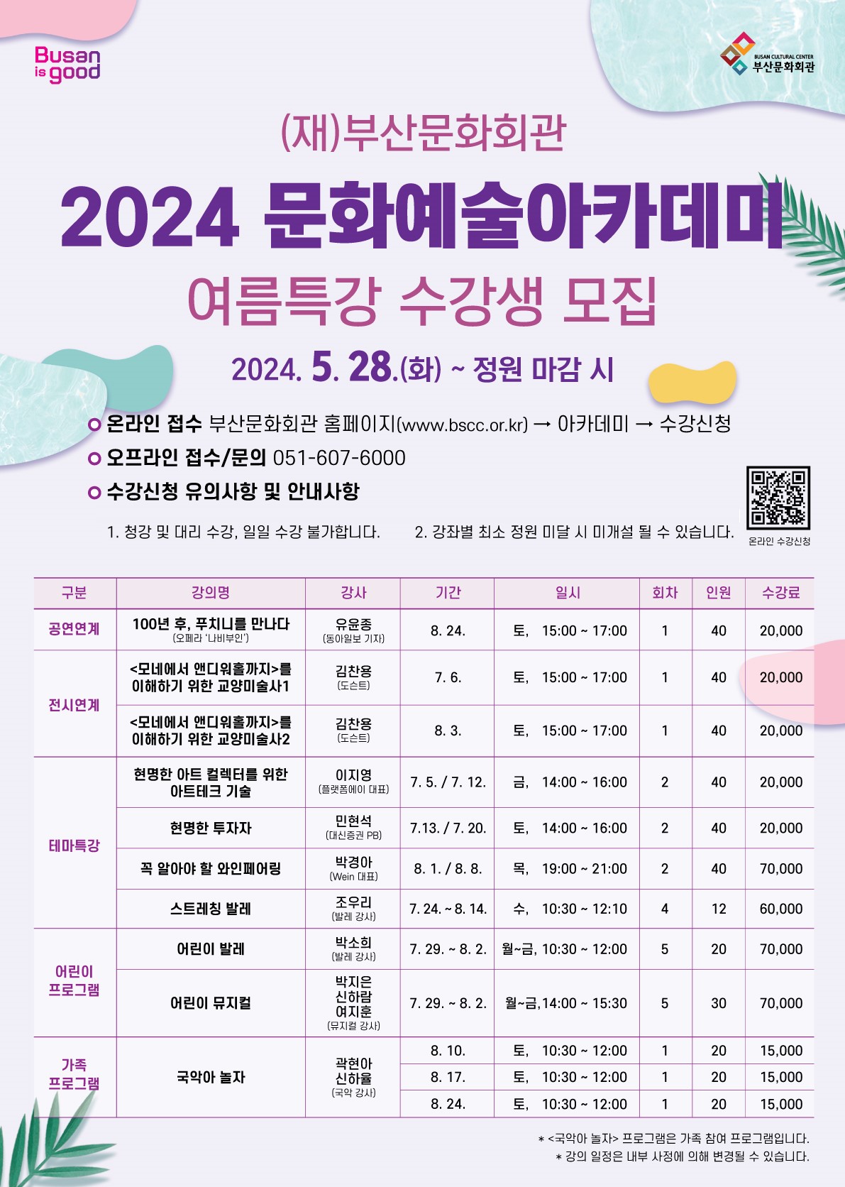 다채로운 <2024 (재)부산문화회관 문화예술아카데미> 여름특강의 수강 신청은 오는 28일(화)부터 진행될 예정이며 전화예매(051-607-6000) 및 홈페이지의 아카데미 카테고리(https://ticket7.bscc.or.kr/Academy/Course/Index)에서 수강 신청 가능하다. 복지 할인 및 정기회원 할인, 아카데미 수강 시 수강 기간 중 무료 주차권 제공 혜택도 받을 수 있다.